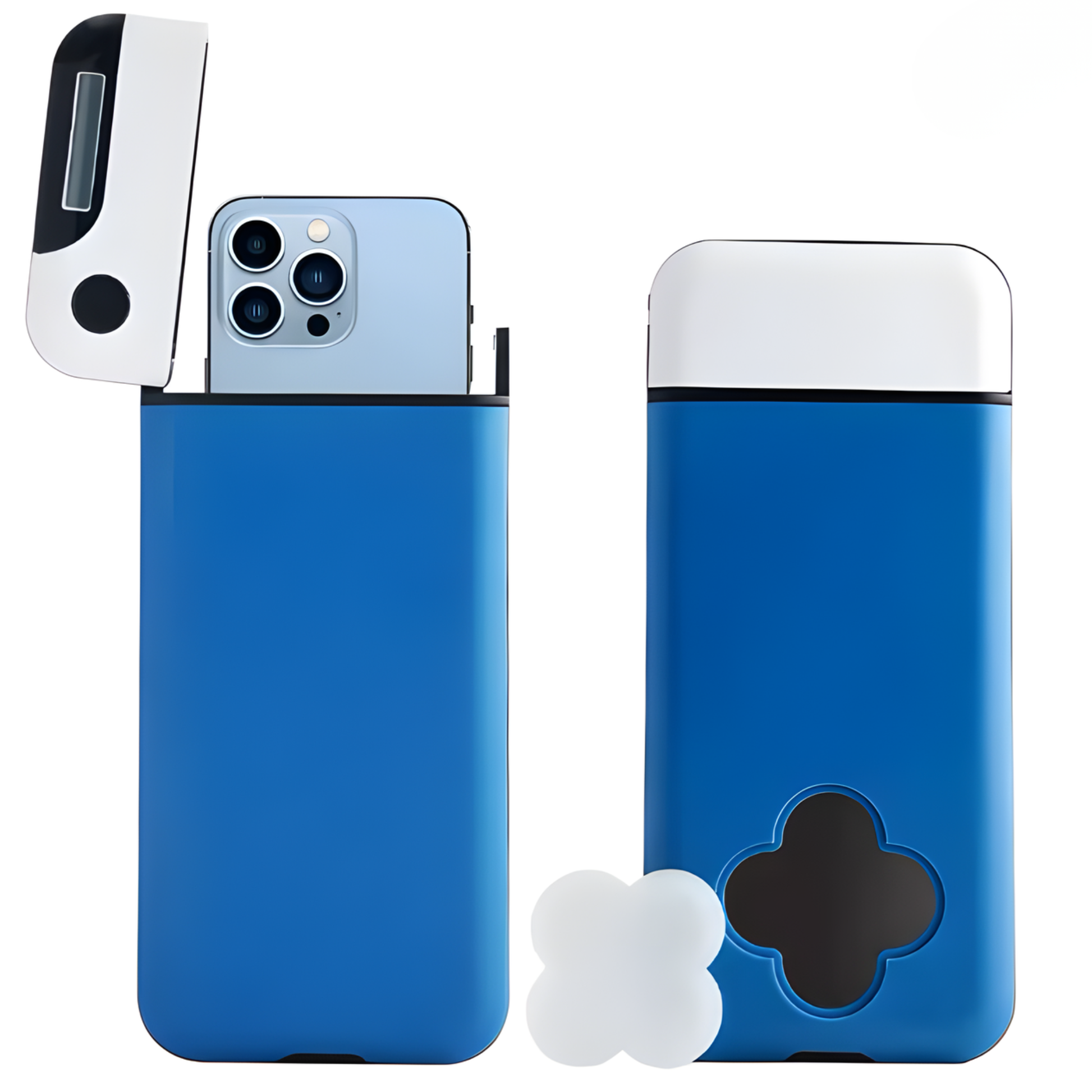 Funcionamiento: Introduce el móvil ➔ Pulsa el temporizador (5 min a 12 h) ➔ Tienes 5s para cancelar ➔ ¡Bloqueo activado!
